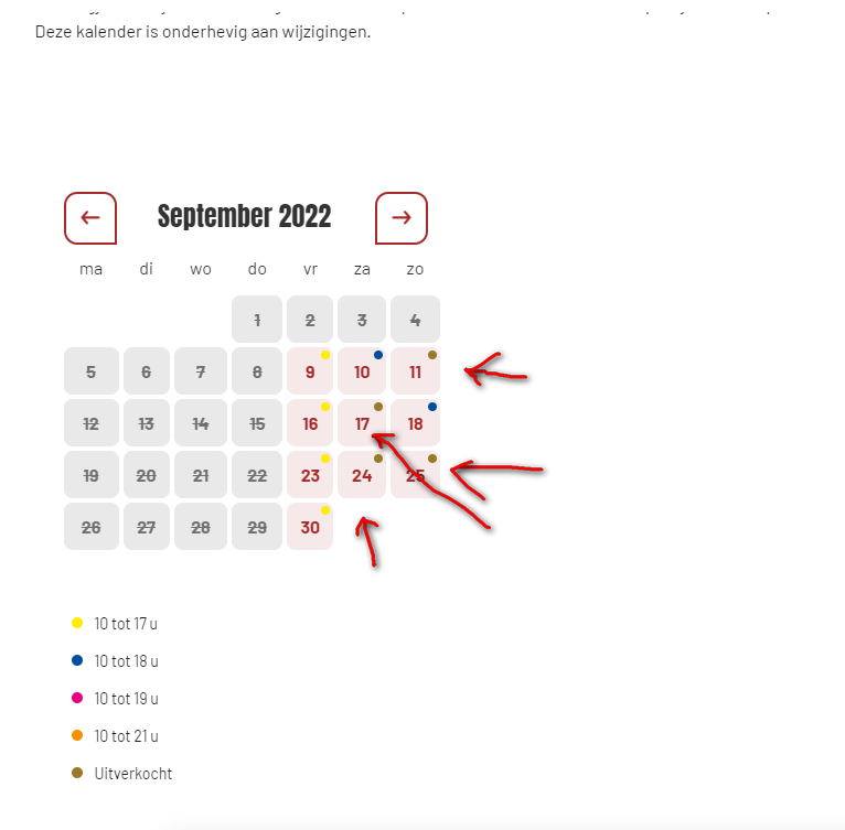 Wanneer ik op de site van Bobbejaanland kijk en gewoon naar openingsuren klik zie ik deze kalender met vier uitverkochte dagen.