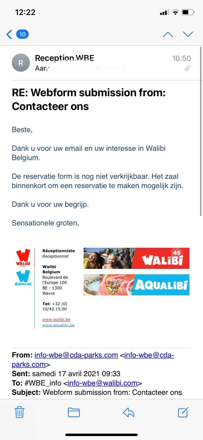 Het gaat hem vooral op de vreselijke communicatie ... Dit is al jaren een probleem, en Walibi doet er niks aan. Als dit je antwoord is op een mail, 3 weken na versturen, zou je voor minder huilen ...: