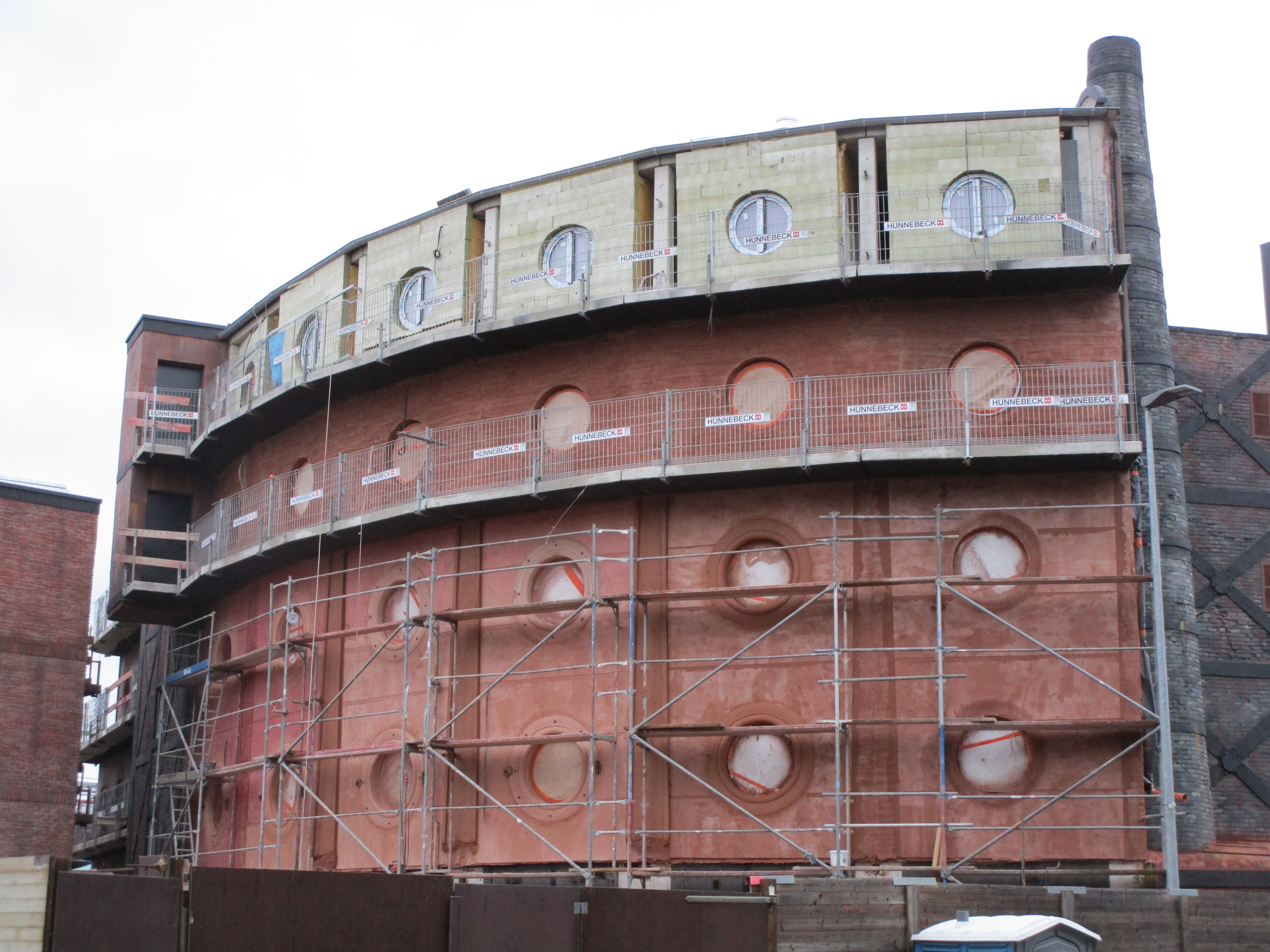 - Onder de grote ijzeren constructie links van de mega fabrieksmuur wordt ook iets opgebouwd.
