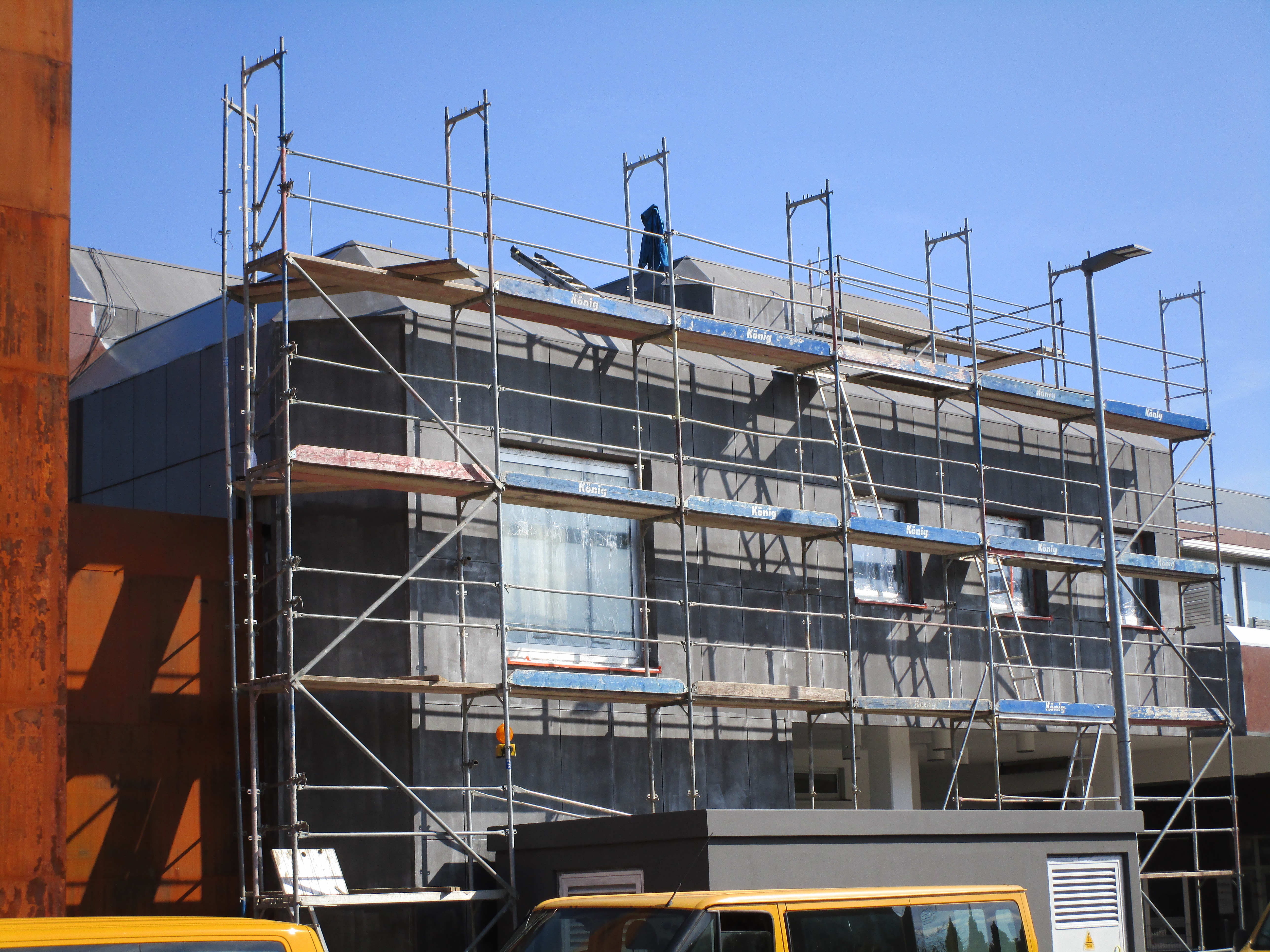 De gevel van het voorste hotelblok wordt momenteel onder handen genomen:
