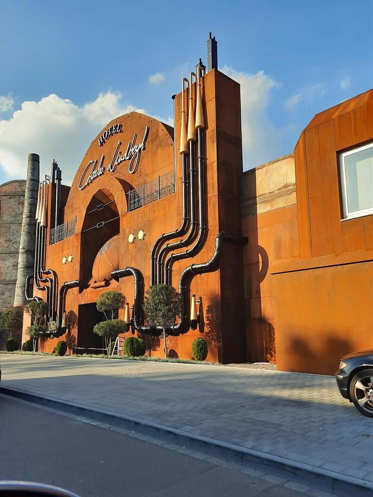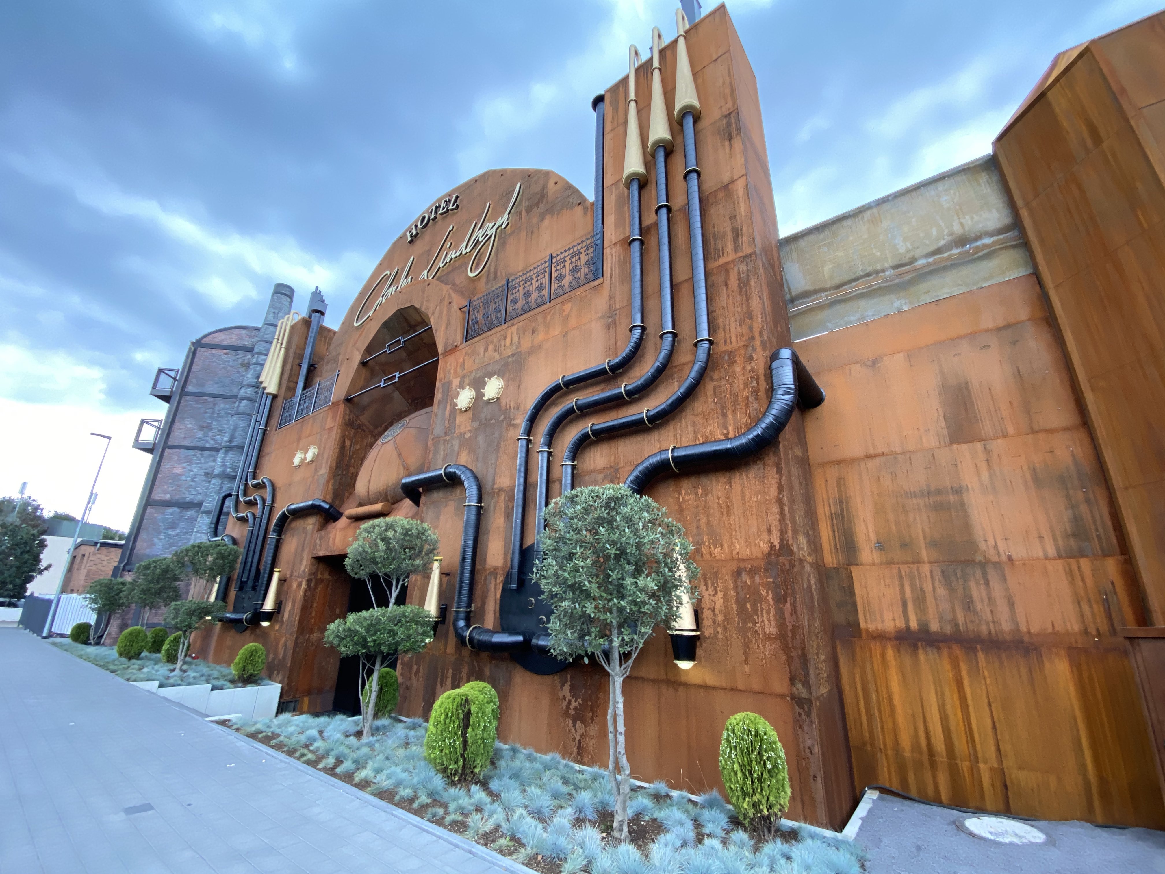Ik ben benieuwd wat er nog aan die hotelgevel gaat veranderen eer het 'af' is. Het zwart van de deur gaat beter samen met het buizensysteem daarnaast, maar het is wel overduidelijk dat dat portaaltje nog niet in zijn definitieve gedaante te zien is. Ik verwacht op zijn minst nog een (tegel)vloertje en deurklinken en het stuk naakte metaal linksonder lijkt me ook niet voor de eeuwigheid.