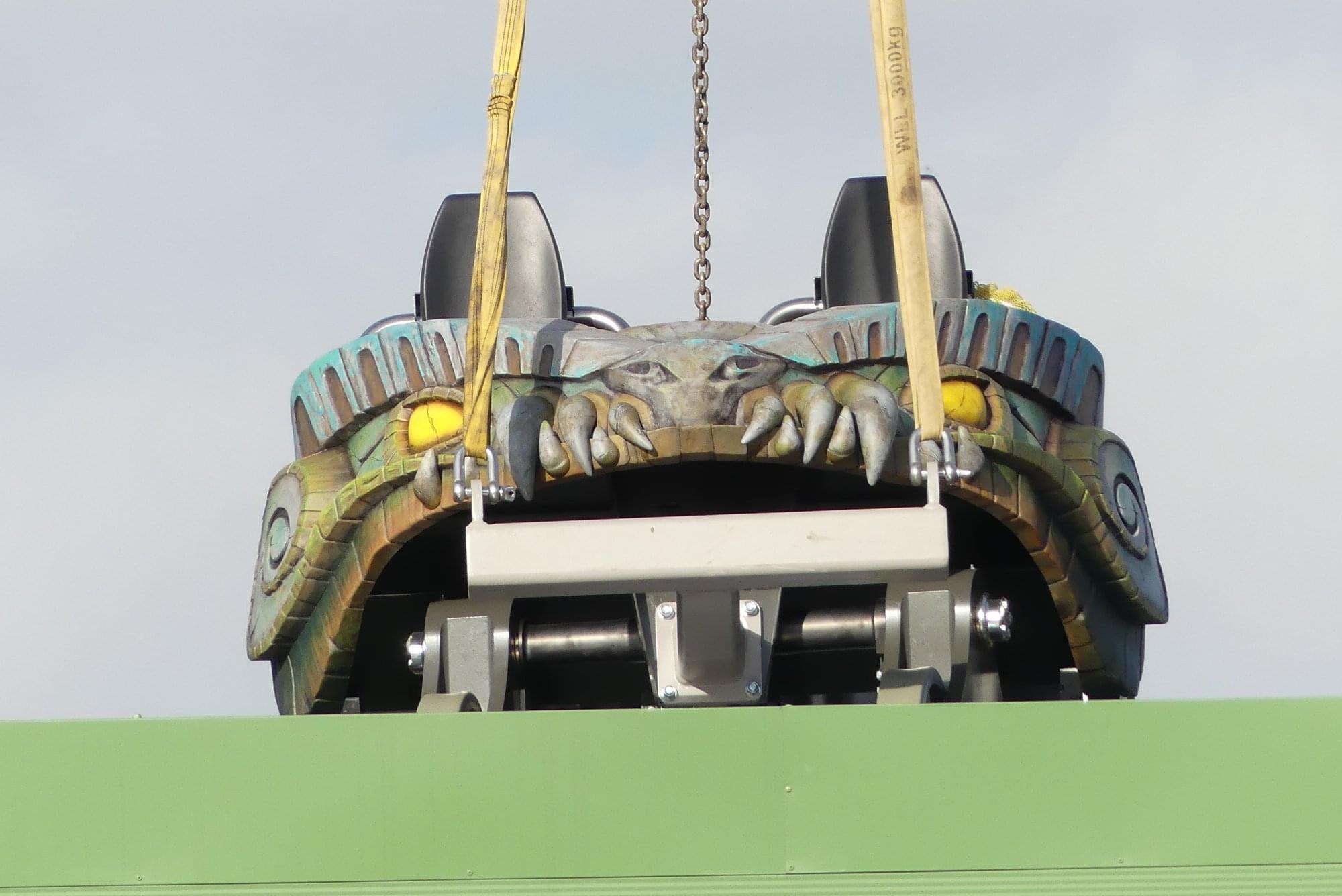 Gebaseerd op de nabijgelegen Egyptische attractie en het design van de trein zie ik ze voor het thema wel werken met de krokodillengod Sobek. Het past in het thema en zowel de ogen als tanden komen me behoorlijk krokodillig over.